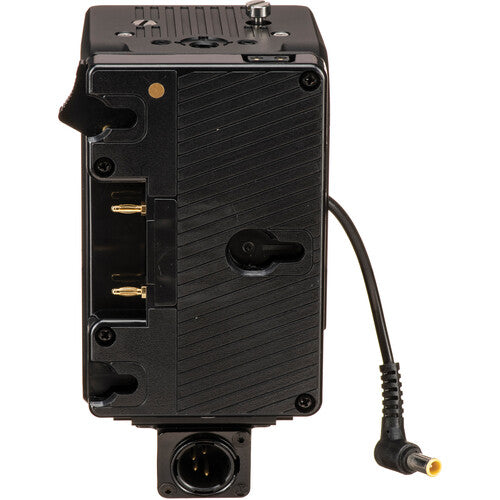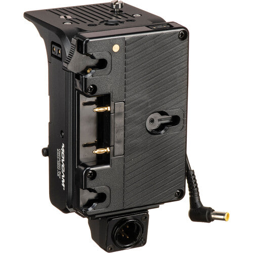 The Gold mount Distributor Box for Sony FX9 from Movcam features both a Gold mount plate and a 4-pin XLR port for powering the camera. Either can be used, as you find most appropriate. Attaching to the back of the camera, the Distributor Box delivers 19.5V to the camera. The XLR port delivers 19.5V directly. When using a Gold mount battery, the battery's output is converted to 19.5V.